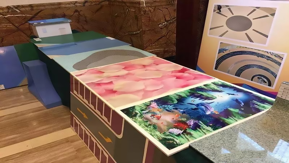 地坪與3D藝術(shù)完美融合,在常規(guī)地坪涂裝施工過(guò)程中,鋪設(shè)一層畫布,然后再加上水晶漆透明罩面,表面閃耀著水晶般明亮艷麗的光澤,閃光效果柔和,絢彩迷人。